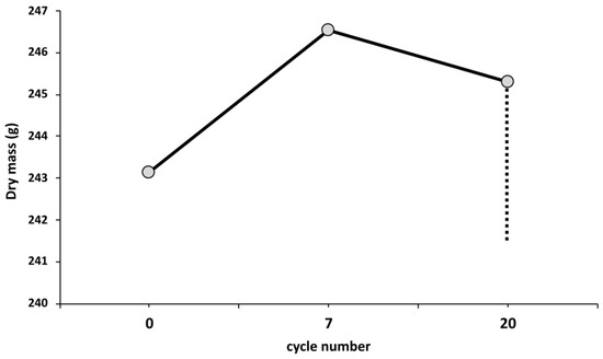 Example of A-L sample illustrating the relative changes in mass throughout the salt weathering experiment. The mass during the experiment (7th, 20th cycles) is higher than the original mass due to the presence of salts. The final mass obtained after cycle 20 is after removal of salts.