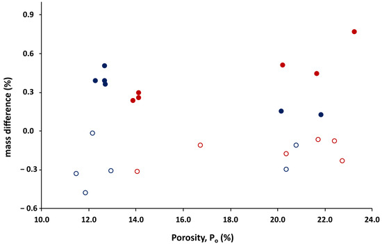 The relationship between Po (%) and material loss (decay) of A-C (blue circles) and A-L (red circles). Treated samples were less prone to decay overall while untreated samples experienced relatively higher amounts of decay. Note negative values imply presence of salts in addition to less decay. Open circles are treated samples after weathering and solid circles are untreated samples after weathering.