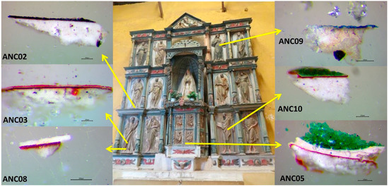 Microsamples were extracted with a scalpel from coloured areas of the polychrome of the altarpiece of the Church of Ancoraimes (Figure 1). Some of them were fragmented to an area less than 1 mm2 and were embedded into an acrylic transparent resin Subiton® (Buenos Aires, Argentina) to prepare their cross-sections by polishing with a decreasing sandpaper particle size (down to 12,000 mesh). The description of their colours and location is given in Table 1. In Figure 1, the images of the cross-sections observed under the optical microscope are shown. In this work, we paid special attention to the green samples.