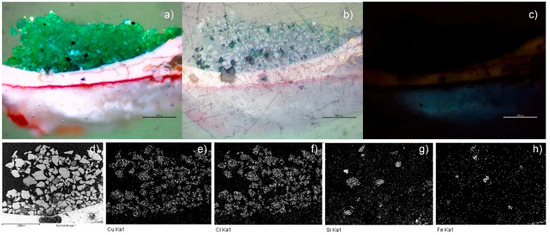 Image of the cross-section of the green sample ANC05, optical image (50×): (a) visible, (b) polarized, and (c) UV (350 nm). SEM-EDS: (d) backscattered electrons (BSEs) micrography (400×), mapping of (e) Cu, (f) Cl, (g) Si, and (h) Fe. (Scale reading 200 μm.)