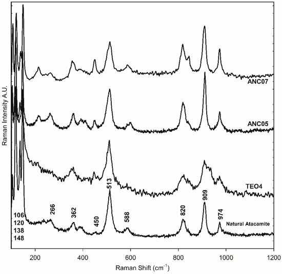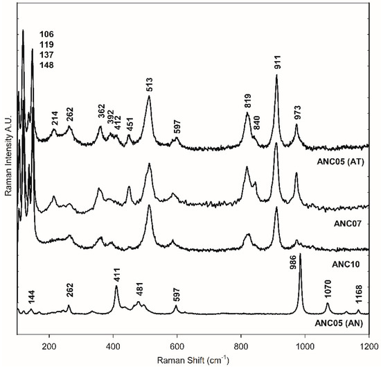 The green samples, ANC05, ANA07, and ANC10, were specially analysed as they showed atacamite as the main pigment in the different techniques used for pigment identification, as will be shown in the following. Figure 2d–h shows the SEM-EDS mapping of the cross-section of sample ANC05. The green layer of the sample shows mainly copper (Cu), chlorine (Cl), Si, and Fe content (see also Table S1). This observation, together with the distribution and size of crystals, is similar to that obtained for the green sample of Our Lady of Copacabana, where the presence of atacamite with traces of quartz (SiO4) and hematite (Fe2O3) was demonstrated, corresponding to the presence of the elements Si and Fe, respectively [1]. The samples were measured using Raman spectroscopy in the green layer of the cross-section as shown in Figure 3, showing the presence of atacamite in all the green samples. The main bands identifying this mineral are 148 and 119 cm−1, corresponding to O-Cu-O bending; 262 cm−1 to lattice modes; 362 cm−1 to Cu-Cl stretching; 513 cm−1 to CuO stretching; and 819, 911, and 973 cm−1 to O-H deformation [19,20]. Additionally, one of the samples (ANC05 (AN) in Figure 3) shows bands at 144, 262, 411, 481, 597, 986, 1070, and 1168 cm−1, corresponding to another copper compound, antlerite (Cu3SO4(OH)4) [21], which has already been identified in Andean mural paintings [3,4,22] and has recently been found together with atacamite [23].