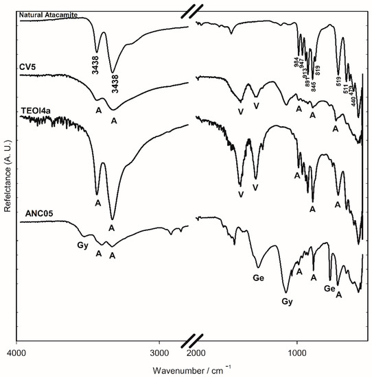 FTIR-ATR spectra of the surface of altarpiece (ANC05), synthesised using recipes (TEO4a) and (CV5) and natural atacamite (ATA84) samples. V: verdigris, A: atacamite, Gy: gypsum, and Ge: gerhardtite.