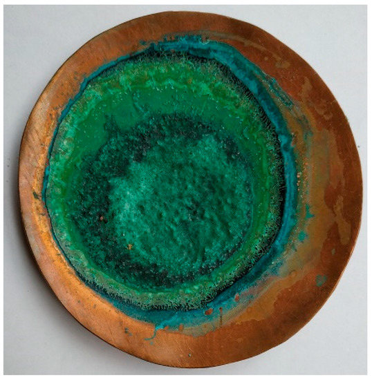 Recipe of Theophilus Presbyter (TEO): The recipe to produce verdigris viride salsum from the 12th century (Book I, Chapter XXXVII) describes the exposure of a copper plate covered with honey and salt to vinegar vapours in a closed environment [11]. Metallic copper plates and rods (Primalco S.A., Buenos Aires, Argentina) of 99.9% purity were used in contact with commercial wine vinegar of certified organic origin (so as not to introduce any additives), NaCl (Química Oeste S.A., Buenos Aires Argentina, analytical grade), and organic honey in an airtight glass container (Figure S1). Thirty replicates of the experiment were carried out, and we varied the exposure time to the vapours between 4 days and 3 months, the use of honey and the thickness of the deposited layer, the amount of sodium chloride, and the use of vinegar in the reaction medium.