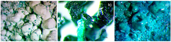 Figure 8a,c show OM images of the results obtained in one of the viride salsum (TEO) and cardenillo vermicular (CV) experiments, respectively, together with one of the natural atacamite samples in Figure 8b. Using FTIR-ATR and SEM-EDS, it was confirmed that these were atacamite particles. By observing the samples under the MO optical microscope, we found there was a notable difference between the crystallization form of the synthetic compound and the natural one. However, if these observations are accompanied by molecular analysis, each compound can be identified, and hypotheses of a natural origin can be formulated.
