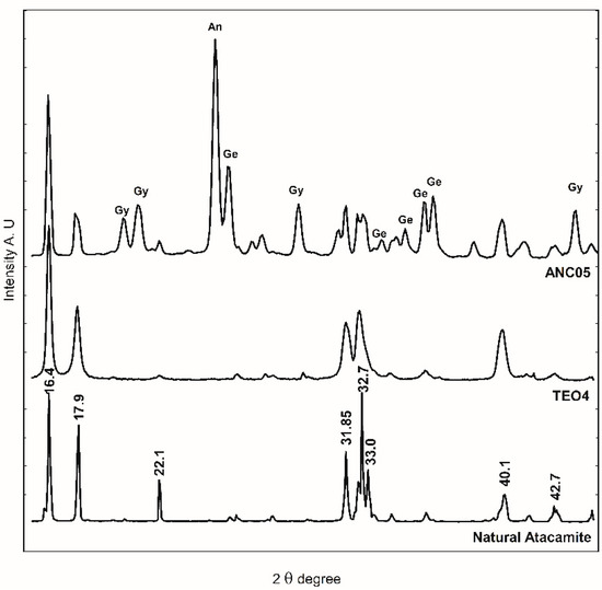 WAXS diffractogram of sample ANC05, natural atacamite, and synthetic atacamite (TEO). An: antlerite, Gy: gypsum, and Ge: gerhardtite.