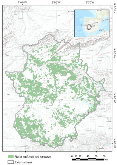 The dehesa is one of the most representative landscapes of the Iberian Peninsula. It covers more than 3.5 million hectares, two-thirds of which are located in Spain, while one-third is in Portugal, where it is called “montado” or “mounted” [1]. Broadly speaking, the dehesa can be understood as an agrosilvopastoral system that possesses unique characteristics that make it exclusive in the world [2]. It is a space in which man has intervened to achieve better agricultural and livestock production while maintaining the original forest use [2]. The dehesa has been defined in many ways throughout history, in some cases in an incomplete, contradictory, and even very limited way at the legislative level [3]. This complexity of definitions increases if we consider that it is not a static unit but that it changes with the evolution of societies and their adaptation to the environment [4].