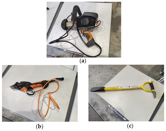 New tools designed for cork harvesting: (a) electric chainsaw; (b) electric cork tongs; (c) technological lever for cork removal. Source: Tools provided by the Center for Scientific and Technological Research of Extremadura (CICYTEX).