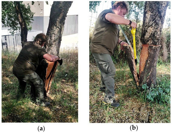 Changes in the cork detachment process: (a) traditional extraction method; (b) modern extraction method. Source: authors based on the cork stripping work carried out by a cork puller from CICYTEX.