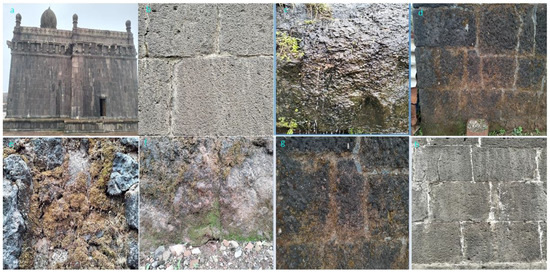 Figure 2a–h shows a close view of the stone surfaces of Raigad Fort, depicting various stages towards the formation of an oxalate patina. Figure 2a shows the Jagdishwara temple in the fort complex with calcium oxalate covering the entire basaltic wall. A close-up view of the same stone surface with oxalate covering can be seen in Figure 2b. In Figure 2c, a surface covering of Ca-oxalate with a glittering shine in the sun is observed. Figure 2d shows the growth of microvegetation on basaltic wall surfaces and binding lime at the start of the monsoon season. In Figure 2e, exposed stone surfaces with oxalate covering as well as the growth of microvegetation on some parts of the surface stone are observed. At the start of the summer season in the month of February every year, the vegetation growth on the surface of the stone starts to dry. Figure 2g depicts a close view of the drying of vegetation from the fort’s basaltic wall. No major chemical cleaning work has been carried out at Raigad Fort so far. In Figure 2h, enhanced porosity of the surface stone due to cleaning and removal of the Ca-oxalate patina is observed.