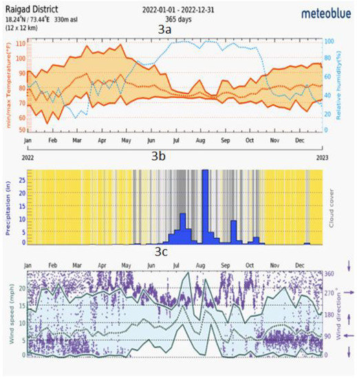 (a). Temperature and relative humidity Vs time graph of Raigad. (b). Precipitation diagram of Raigad. (c). graph showing the wind direction and wind speed at Raigad. (derived from www.meteoblue.com (accessed on 28 May 2023)).