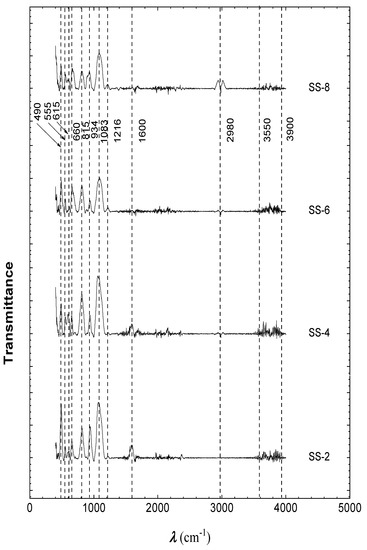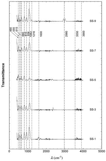 The FTIR interferograms of stone samples SS-1 to SS-9 are depicted in Figure 4 and Figure 5, and the relevant functional group data in respect of all the samples is listed in Table 3.