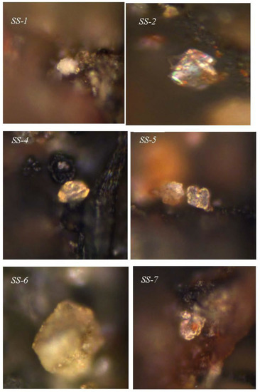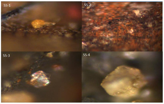 The patina along with the substrate was observed under an optical microscope for samples numbers SS-1 to SS-4. The optical images obtained are shown in Figure 7 for the interface of the substrate and calcium oxalate patina layer. The bipyramid images of whewellite crystals on the stone surfaces are clearly visible under an optical microscope. The substrate layer represents the basaltic rock appearance in the optical images. The patina adheres very well to the stone surfaces, which protects it from further deterioration. The thickness of the observed patina was around 20–30 microns.