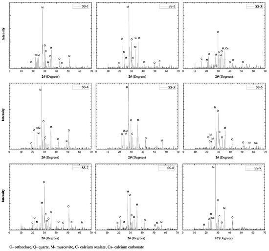 The mineralogical analysis was performed through the XRD of the stone samples. The XRD spectrum obtained is shown in Figure 8 for samples SS-1 to SS-9. On the stone surfaces, the major minerals observed are muscovite and orthoclase, with traces of quartz in some samples, in agreement with the FTIR and SEM-EDX data of the samples. The stone samples SS-3, SS-6, and SS-9 show traces of calcite on the stone surfaces. However, no calcite peak was observed in the FTIR spectra of the stone samples. The XRD diffractograms do not show any gypsum peak on the stone surface that supports the FTIR results of the samples.