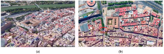 The urban environment and location (red curve) of the disappeared Puerta Real. Google Earth Pro 2023 [accessed on 15 April 2023]: (a) 3D aerial view; (b) Top view.