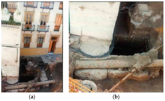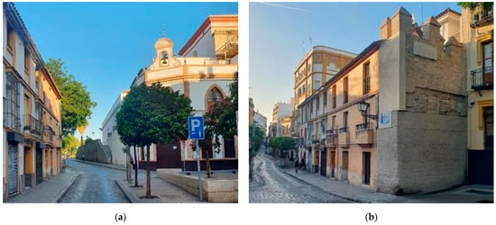 The following photographs offer a brief visual tour of the present-day urban environment: the end of Alfonso XII Street and the Chapel of Our Lady of Sorrows (Figure 2a), the preserved city wall remains (Figure 2b), the San Laureano building and Liñán Street (Figure 3a), the meeting of Barca and Goles streets (Figure 3b), a view of Goles Street and the Church of San Laureano (Figure 4a), and a view of the Plaza de la Puerta Real (Figure 4b).
