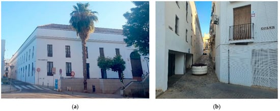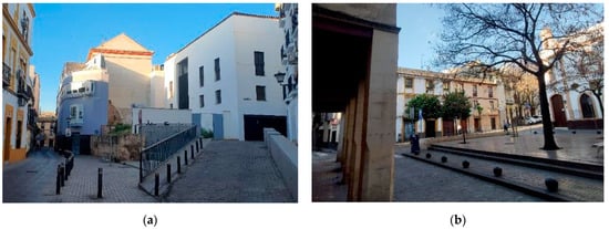 The urban environment of the disappeared Puerta Real. Authors’ photographs, 2023: (a) View of the San Laureano building and Liñán Street; (b) View of Barca Street from Goles Street towards Plaza de la Locomotora.