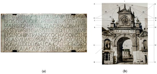 In previous research [], the process for the virtual, geometric and dimensional reconstruction of the disappeared Puerta Real is described without considering textures or lighting. For this purpose, the only surviving photograph Masson took around 1855–1860 and then commented on was used. It was processed with Asrix software to rectify the image as per the elevation. To deduce dimensions from the photograph, measurements were obtained from the preserved archaeological remains: the adjacent wall; the pavement that has marked the position of the gate since its archaeological excavation in 1995; and a 160 × 70 cm memorial stone plaque that was part of the gate (Figure 6a), today placed on the adjacent section of the wall. The measurements from the late 19th-century plans, discussed below, have also been examined. In addition, it was assumed that classical architecture is always based on interrelated proportions. Following Hernán Ruiz II’s Book of Architecture [] and Sebastiano Serlio’s treatise [], geometric tracings were used to support the general architectural design and its details (Figure 6b).