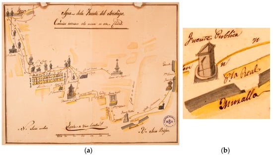Anonymous view of Seville c. 1764, ‘Agua de la Fuente del Arzobispo. Cañerías interiores de la misma en esta Ciudad’. Archivo Municipal de Sevilla, Pl. I-3-63, Digit. 4727: (a) General view of water distribution in the city; (b) Detail of water fountain in Puerta Real.