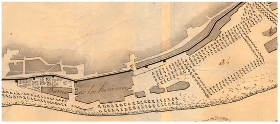 Detail of the city map by Yldefonso Sierra, 1837. Cartoteca del Archivo General Militar de Madrid, PL SE-9/20 [available online: https://www.sevilla.org/cartografia-historica (accessed on 15 April 2023)].