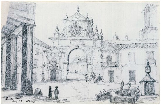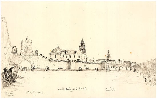 One of the drawings was made outside the city (Figure 12). As previously mentioned in Olavide’s map, the lower part of the gate was hidden by the retaining wall due to its depressed topographical position. The façade of the Colegio de San Laureano appears on the left, whose decadence was accentuated after the despoilment during the Napoleonic invasion, a fire in 1817 and some subsequent marginal occupations []. The church of Nuestra Señora de la Merced, today part of the Museo de Bellas Artes, stands out behind the wall, and the Giralda can be seen in the background.