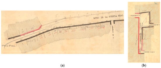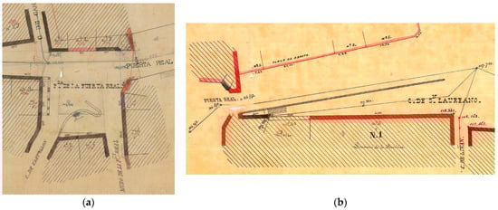 In the vicinity of the Puerta Real (Figure 10), the retaining wall that formed a ramp next to the city wall, shown in other city maps and demolished around 1856, is depicted. A staircase is also shown next to San Laureano. The considerable length of the ramp and the number of steps of the stairs indicate the considerable difference in level between the level of the Puerta Real and its exterior, which still exists today. These accesses may have been formalised under the programme of repairs and reforms of the assistant Marquis of Monterreal in 1758, centred on the city gates. The building of San Laureano and its church were also depicted, with a street or passage between the two, the existence of which has not been ascertained.