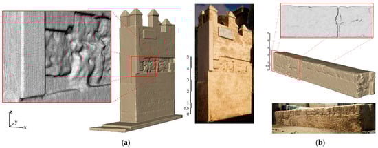 In the urban environment of Puerta Real, the existing remains of the former city wall are two: (a) a five-metre section in length adjacent to the disappeared gate (Puerta Real) and (b) a second section on Goles Street, 16.70 m long. As seen above, the segmented point cloud was used to 3D-reconstruct these elements from the original resolution. The 3D meshing procedure was carried out with the smoothening degree determined by the Octree depth level 9 (level 10 for (b)), as in [], by implementing the ‘Screened Poisson Surface Reconstruction’ algorithm [] in CloudCompare. This smoothening degree was selected given the accuracy analysis carried out by those authors and the unsuitable experimental results with higher levels in this research, which produced noise on wall surfaces. Due to its height, when occlusions occurred on hidden parts and at the top of the adjacent wall section (a) during the TLS survey, the hidden sides of the walls (back and bottom) and the back of the battlements, respectively, were 3D-reconstructed by inserting point grids on plane surfaces created to define their geometry. Similarly, in order to determine a closed volume for the two sections of the wall, measurements were taken of their thickness. Thus, the algorithm computed watertight 3D meshes of the wall sections to be next inserted into the 3D urban environment of Puerta Real.