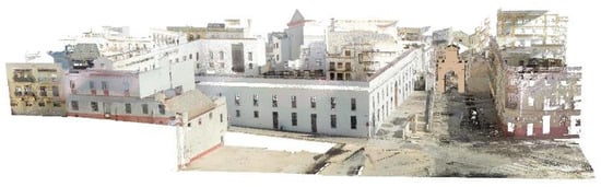 In order to use the TLS data to generate 3D models, removing unwanted elements and noise is desirable; i.e., the 3D point cloud requires a segmentation process. CloudCompare software [] was used to create trimming polylines and clean the data. Also, processing fewer points eases data handling, which means smaller file sizes. This was achieved by subsampling the global point cloud except for the remains of the former city wall, which maintained the original point resolution (3 mm) so that their geometry could be analysed in the future. The point reduction was determined by distance, set to a minimum of 30 mm between points, reaching over 97% decimation. Once the point cloud data were processed, the 3D reconstruction took place.