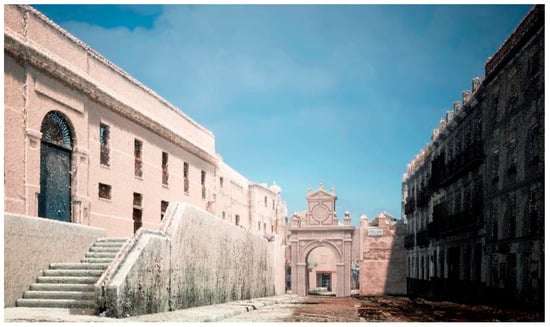 Finally, in terms of possible future research, several destroyed heritage buildings are of interest, such as the Campanile in Venice [] or the German Pavilion in Barcelona by Mies van der Rohe [], which were reconstructed in their original location. In the case of the Puerta de la Latina in Madrid, the reconstruction was carried out in a different location, next to the Higher Technical School of Architecture []. It is also worth mentioning other debatable reconstructions that have favoured the social and cultural revitalisation of the place, as has happened in the Silk Road in China []. Considering the above, this paper aims to motivate future debates on the possible scientific reconstruction of the disappeared architectural heritage and its environment in contemporary culture.
