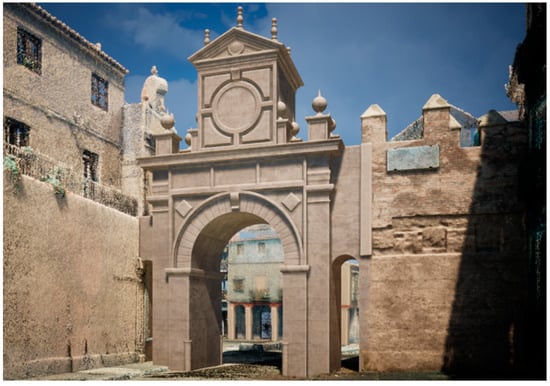 Furthermore, it should be noted that the use of various digital technologies enabled the highlighting of a clear difference between the current state of surroundings (represented using the point cloud), the preserved remains of the wall (graphic documentation through 3D meshes) and the gate that disappeared and was recreated graphically (CAD modelling). Given that greater definition was sought for the disappeared gate and the archaeological remains, no homogenous treatment of all those elements in a single 3D model seemed to be appropriate. For this reason, a hybrid digital model developed on a platform based on videogame graphic engine technology was chosen for its ease of use, versatility, speed, and the graphic quality obtained. This procedure has been used for the first time in the reconstruction of the disappeared 16th-century gates in the city of Seville. Its use will allow the creation of immersive experiences to explore this urban environment for future dissemination purposes, taking as a reference a previous case study on the oldest inn in England (1189 AD) [].