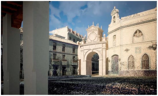 A very extensive bibliography exists on the digital modelling of architectural heritage over the last decades. From it, works on methodologies [,] were consulted on specific case studies and 3D reconstruction of missing heritage [,,], and a recent book that gathers cases studies and compares experiences about digital restoration and virtual reconstructions []. Also, it was particularly interesting to address video game graphics engine technology applied to heritage, as it facilitates visualisation with a certain degree of realism and interaction for all types of users. This technology has been used in the scientific literature to render urban and natural environments, including heritage buildings [,] and sites [] and fictional proposals for the sake of sustainable development [] and aimed at landscape research and design teaching [,,]. Future research into artificial intelligence could generate new fields of work that have yet to be explored.