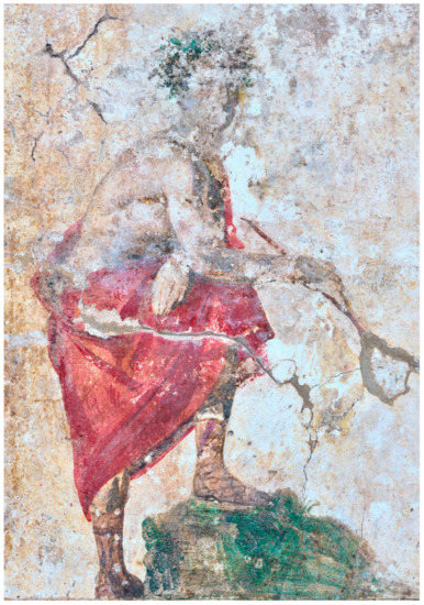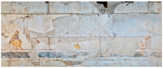 East wall: As for the north side of the wall, large sections were affected by plaster loss. On collapsed plaster fragments that were transferred to the Museum of Pella, parts of the upper body and head of a man were preserved. The man appeared to have dark hair and beard. Still in situ is preserved the man’s lower body; he was possibly seated on a rock, dressed in a himation and holding a staff (see Supplementary Materials Figure S5).