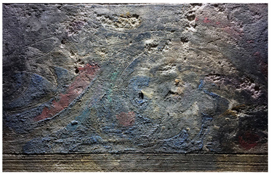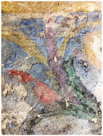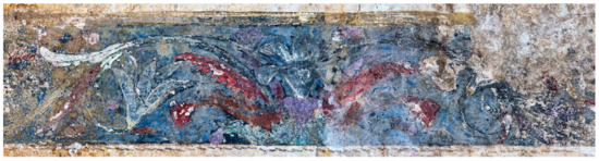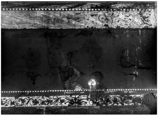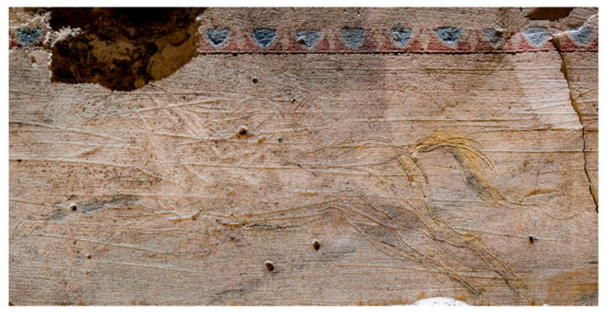 By means of visible- and raking-light photography, it was possible to document the state of preservation of the mortar, deformed and cracked in many areas, likely due to changes in the environment, which is monitored but not controlled (see Supplementary Materials Figure S7). Snapped and incised lines into the fresh plaster were used to set out the horizontal borders of the different pictorial fields and provided guides for the design of the moldings and the friezes (Figure 4).