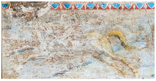 The expressive pictorial process of the artist is evident throughout the painted walls; in particular, the rendering of the equine bodies with multiple quick and curved lines on the upper frieze of the south wall of the tomb exemplifies a dynamic way of painting (Figure 6 and Figure 7).