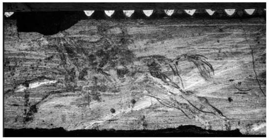 The horizontal lines, however, are only roughly parallel; they slightly vary in distance from the edges and from each other and are uneven in depth, betraying an inconsistent and hurried craftsmanship. Freehand incisions made with a stylus systematically served for the setting out of compositional details, representing a major stylistic marker of the artist that was involved in the decoration of the tomb (Figure 5). In many instances, these incised lines were not precise, but rather improvised and summary, recalling the economic and effective manner in which the preliminary incised drawing was rendered in the famous painting depicting the abduction of Persephone by Hades in the interior or the ‘Tomb of Persephone’ at Aigai [1,8,20] (see Supplementary Materials Figure S10).