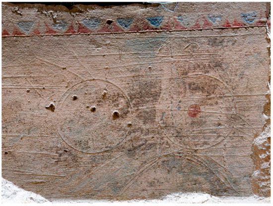 These rough outline sketches were rarely respected when the paint layers were applied. In many instances, the incised lines remained visible even once the painting was completed. Incisions were also used for a compass-drawn guideline around the rosette circles on the south wall (Figure 8). A change in the position of the motif is observed, reflecting the hasty execution of the preliminary sketch and the absence of any kind of means to transfer a finished design onto the surface of the wall.