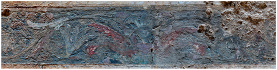 The lack of accuracy in the rendering of the pictorial elements is counterbalanced by the rhythmic expression of the wavy and disobedient lines, eloquently visualizing the frieze’s theme of fertility and vitality. Floral elements do not reiterate themselves as in a calculated and rigorous composition; rather, each element is unique in its spontaneous and nervous execution, underscoring the role of this preliminary sketch in the overall aesthetic and stylistic character of the painting. Incisions here are not quite as deep as in the horse-race frieze, and they remain barely visible under the thick paint layers applied over the plaster. It seems likely that these incisions were not created directly on a wet plaster but rather on a pictorial layer composed of carbon black that served as an undercoat to the subsequent paint layers of the scroll frieze (Figure 11 and Figure 12).