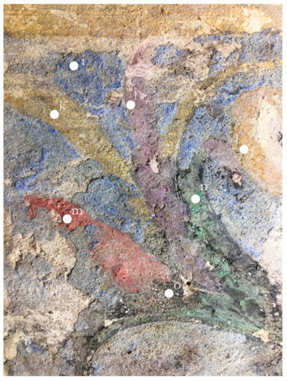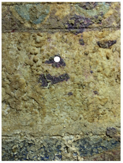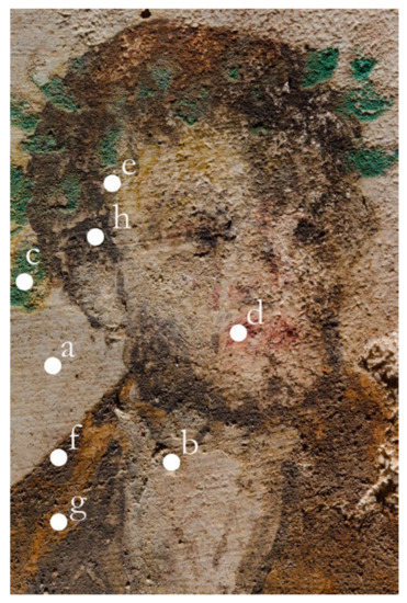 Although extensive losses of the pictorial layer and plaster deformation were documented by the time of the tomb’s discovery in 2001 (see Supplementary Materials Figure S7), the general condition of the preserved wall paintings was good. ‘First-aid’ conservation interventions were carried out shortly after the tomb was unearthed, as described by the then director of the Department of Conservation of Ancient and Modern Monuments, N. Minos [17]. Earth accretions and dirt deposits were removed mechanically in the course of an initial cleaning of the painted surfaces, while saline incrustations were dissolved and removed using both mechanical and chemical methods. Consolidation of the detached plaster was achieved with the use of hydraulic lime and inorganic fillers. For the re-adhesion of loose paint layers, acrylic resins were used. Despite the fact that the interior of the tomb has remained inaccessible to the public and was protected by a modern shelter, the in situ preservation during the past two decades has caused further damage to the mural paintings, mainly due to environmental and biological factors, such as moisture, salts and fungi (see Supplementary Materials Figure S8). Such deterioration is particularly visible on the faces of the figures, in which paint layers have lost their original chromatic intensity and cohesion (see Supplementary Materials Figure S9).