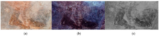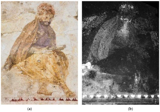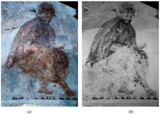 The men represented in the main figural scene appear to inhabit a unified landscape, primarily defined by rocks. In the case of the ‘reader’ of the north wall, VIL images revealed further elements of scenery (Figure 20a,b): the curving contours surrounding the figure, thus rendering a feature in front of which this figure was meant to be seated, could correspond to the mouth of a grotto. On the south wall, UV-induced luminescence images significantly enhanced the visibility of the rock on which the bearded figure is seated and the plant which grows on the rock’s proper right upper edge (Figure 26a,b).