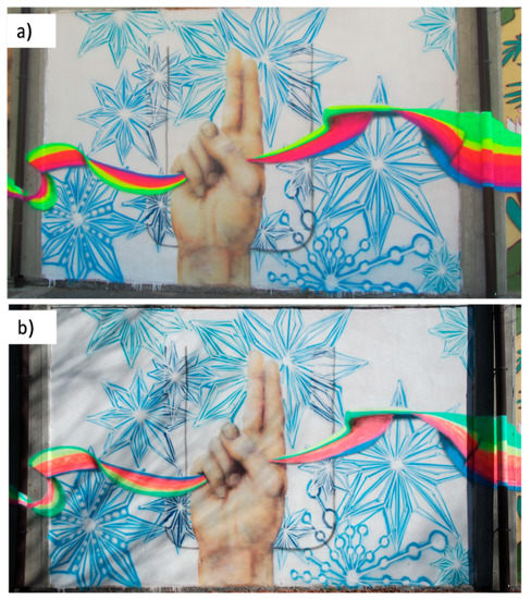 - Alonso-Villar, E.M.; Rivas, T.; Pozo-Antonio, J.S.; Pellis, G.; Scalarone, D. Efficacy of Colour Protectors in Urban Art Paintings under Different Conditions: From a Real Mural to the Laboratory. Heritage 2023, 6, 3475–3498. [Google Scholar] [CrossRef]
