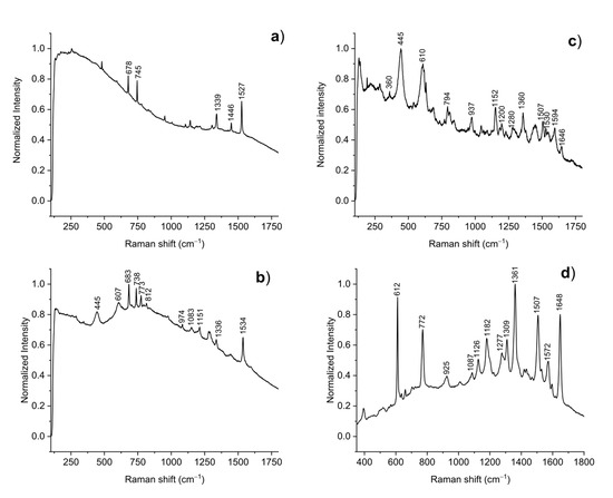- Colombini, A.; Kaifas, D. Characterization of some orange and yellow organic and fluorescent pigments by Raman spectroscopy. e-Preserv. Sci. 2010, 7, 14–21. [Google Scholar]