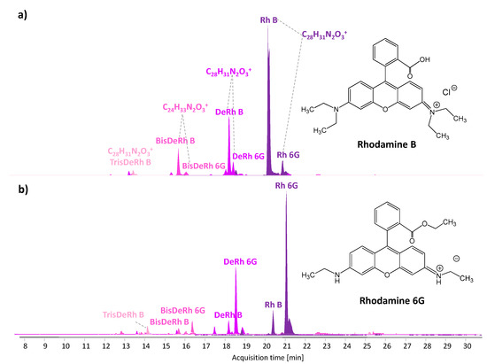 - Ferreira, B.R.V.; Correa, D.N.; Eberlin, M.N.; Vendramini, P.H. Fragmentation Reactions of Rhodamine B and 6G as Revealed by High Accuracy Orbitrap Tandem Mass Spectrometry. J. Braz. Chem. Soc. 2017, 28, 136–142. [Google Scholar] [CrossRef]