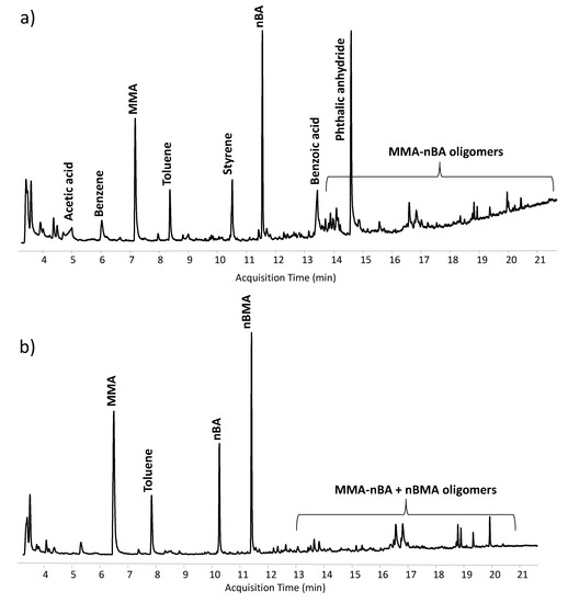 - Doménech-Carbó, M.T.; Silva, M.F.; Aura-Castro, E.; Fuster-López, L.; Kröner, S.; Martínez-Bazán, M.L.; Más-Barberá, X.; Mecklenburg, M.F.; Osete-Cortina, L.; Doménech, A.; et al. Study of behaviour on simulated daylight ageing of artists’ acrylic and poly(vinyl acetate) paint films. Anal. Bioanal. Chem. 2011, 399, 2921–2937. [Google Scholar] [CrossRef]