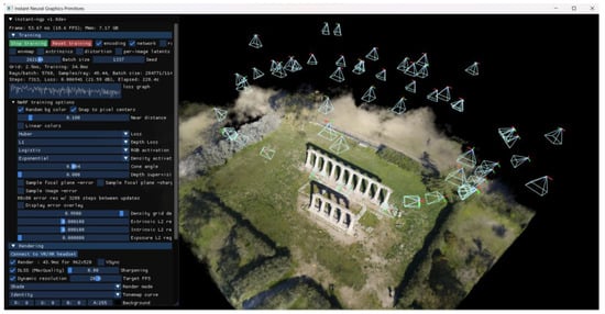 Screen shot of Instant-NGP where it is possible to note the camera network on the 3D model of the “Tavole Palatine” site and on the left side the toolbar containing the different elements for setting and managing the processing parameters.