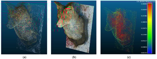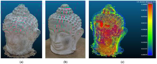 Comparison of the point clouds of the “Buddha” dataset: point cloud derived from Instant-NGP (a); point cloud generated in Agisoft Metashape (b) and metric comparison (c).