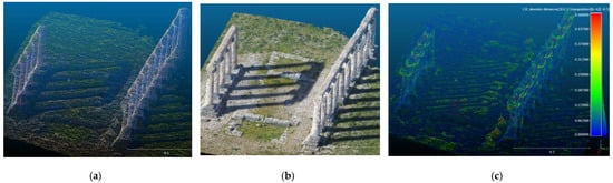 Comparison of the point clouds of the “Palatine” dataset: point cloud derived from Instant-NGP (a); point cloud generated in Agisoft Metashape (b) and metric comparison (c).
