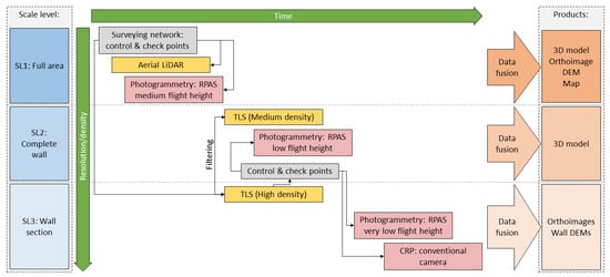 Considering the products to be obtained related to the three scale levels, the methodology proposed in this study is shown in Figure 2, where the different geomatic techniques are displayed considering the acquisition time and from the general to the particular study. In this sense, we divided the procedure considering the use of surveying techniques, LiDAR and photogrammetry. After acquisition, data preprocessing included the verification of the surveyed area to ensure the complete coverage of the wall using one or several techniques at each scale level. After processing the data acquired with each technique at each scale level, we developed a data fusion procedure in order to obtain the final products by integrating data from several sources. The selection of the data source considered some aspects related to density, geometry, accuracy and radiometric quality, although, depending on the complexity of the wall in some zones, we could only use a specific technique (e.g., the highest areas of the wall were only surveyed using RPAS photogrammetry).