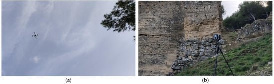 Figure 4. Examples of data acquisition techniques: (a) aerial photogrammetry using a DJI Phantom 4 Pro; (b) CRP using a conventional Sony A6000 camera mounted on a mast. - SL3: At this scale level, we developed two photogrammetric surveys. The first one was implemented in order to obtain high resolution products of the highest areas of the wall. It was performed through an RPAS survey undertaken at a very low flight height using a DJI mini. This aircraft allowed us to acquire closed images of the wall avoiding those issues generated by the presence of trees and other objects (such as poles and lights and power lines). The great maneuverability of this aircraft allowed us to cover the scene completely because of its capacity to position itself in complex and narrow spaces. On the other hand, the lower areas of the wall were surveyed using close-range photogrammetry (CRP) with a conventional camera (Sony A6000) mounted on a mast that allowed us to raise the sensor up to 5 m (Figure 4b). In both cases, we followed the CIPA recommendations for architectural photogrammetric projects using non-metric cameras (called 3 × 3 rules) []. In this sense, we obtained normal and convergent images covering the scene from different viewpoints. The orientation of the images was obtained from several targets that were well-distributed along the wall. The coordinates of these targets were obtained from the high-density TLS point cloud. The average RMS after the orientation stage was 1.4 cm. As products, we obtained a set of oriented photographs, a point cloud and a texture of the scene.