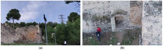 In this sense, the complexity of the scene characterized by the geometry of the wall itself, a great slope of the terrain and the presence of trees constituted a great challenge compared to other cases related to walls (e.g., [,,]). Obviously, these aspects caused the development of a new methodology adapted to this specific case based on the combination of different geomatic techniques at several scales.