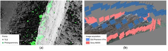 Figure 5. Examples of data fusion: (a) data fusion between TLS point cloud and a selection of points from the photogrammetric point cloud; (b) fusion of photogrammetric projects, including images obtained from RPAS and terrestrial CRP. - SL3: In the case of photogrammetry, we merged two projects that were previously processed independently in order to generate a complete project, including both RPAS and conventional camera images (Figure 5b). After that, we integrated the geometry of the wall obtained using the TLS point cloud and some points selected from the photogrammetric point cloud representing those areas where the TLS had gaps. As in the previous case, the texture was obtained from the photogrammetry. As final products, we obtained an orthoimage (2 mm of spatial resolution) and a DEM (15 mm of spatial resolution) of each section of the wall.