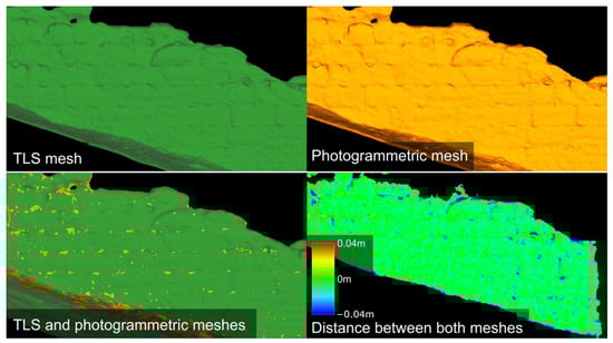 The methodology proposed in this study allowed us to obtain two point clouds from TLS and the photogrammetry of a large part of the wall. As described previously, the geometry of the 3D documentation included in our approach was based on TLS due to the better behavior of this technique considering the characteristics of the object. In this sense, we took advantage of the better definition of the geometry of the wall provided by the TLS due to the simplification in the photogrammetric model caused in internal spaces between the stones (dark areas in the photographs). This effect is clearly shown in the example in Figure 7, where the photogrammetric mesh shows greater distances with respect to the TLS mesh in areas with mortar erosion or holes in the masonry. On the other hand, the photogrammetric survey revealed its feasibility for surveying narrow and complex spaces of the wall. Thanks to the use of RPAS and the mast to lift the camera. the documentation of the wall was achieved in its entirety, albeit mainly in the higher zones.